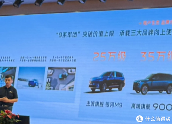 7月30日,吉利集团年中经营大会现场PPT信息显示,即将上市的银河M9定位“主流旗舰”,售价锁定25万元级别。这一价格明显低于同属吉利“9系军团”的领克900(高端旗舰,28.99万起)。